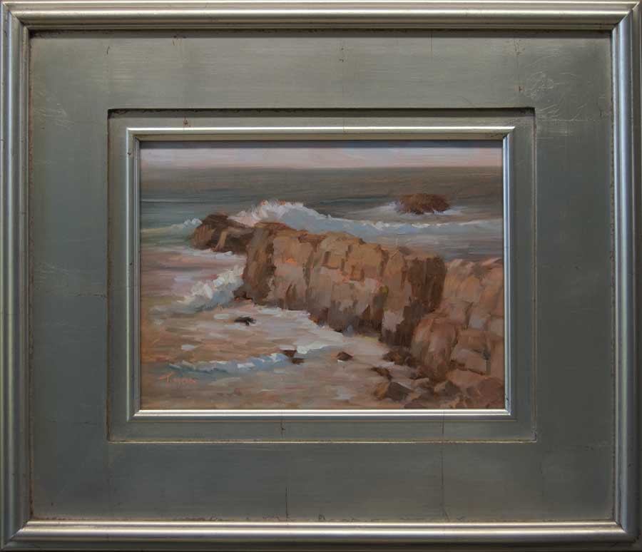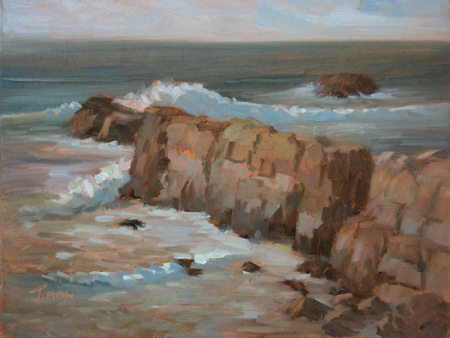 On a blustery day along the coast, I tied my easel down so I could paint. Big wave and warm evening light made for a magical afternoon.